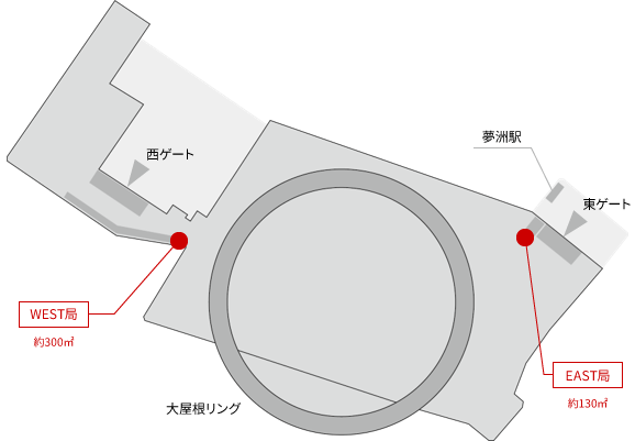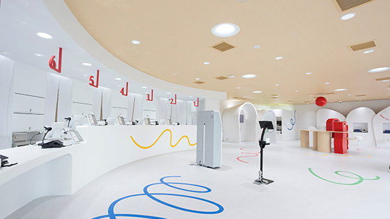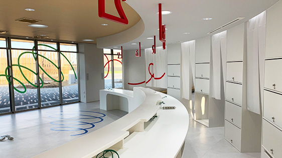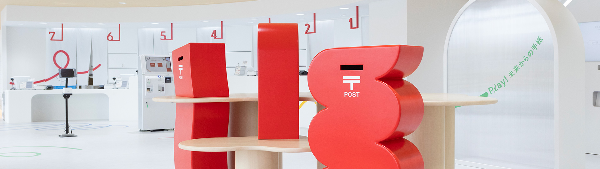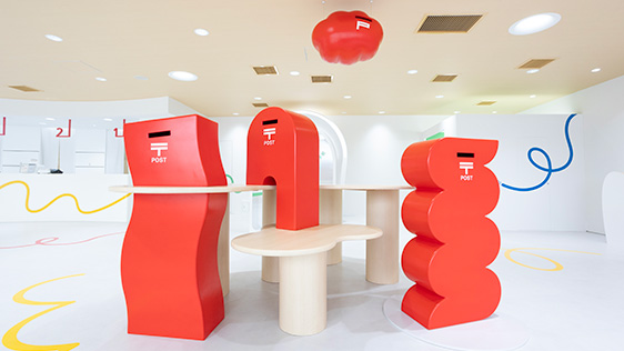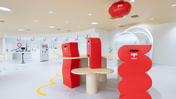 局内にはユニークな形のポストや、最新技術と郵便文化が組み合わされた体験ブースが設置され、キャンバスのような白い空間はコンセプトを体現した手書きのような自由な曲線やポップなサインが彩ります。また、WEST局にはパビリオン出展者向けの私書箱を設置しています。郵便局としての機能やセキュリティ性は保持しながらも、いつもの郵便局にはない、遊び心のある「PLAY!」な空間となっています。
