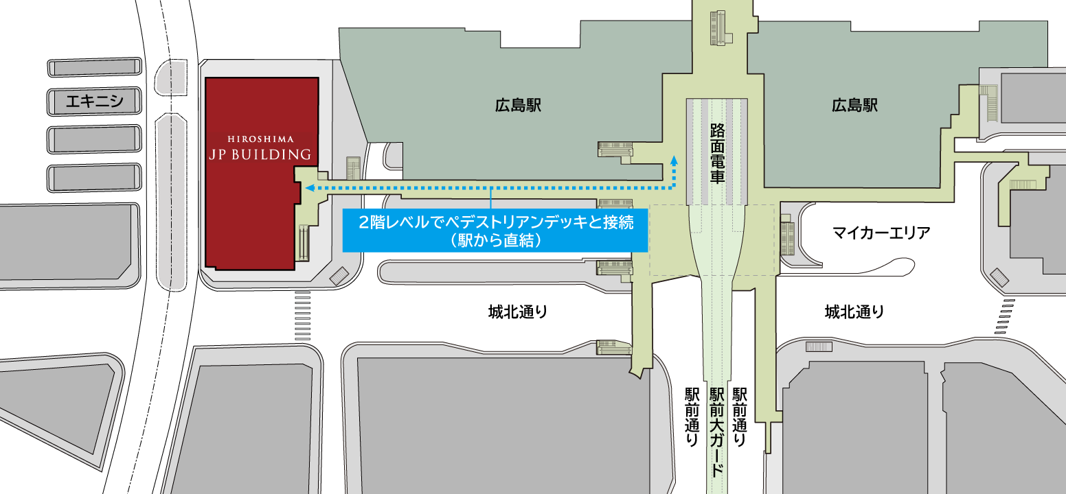 また、駅前広場とレトロな飲食店街として人気がある「エキニシ」とを結ぶ貫通通路や、広島駅自由通路を中心に計画されているペデストリアンデッキにより、JR広島駅や全国初となる駅ビル2階に設置された路面電車のりばと直結し、地区の回遊性一体性の強化や利便性の向上を図っています。